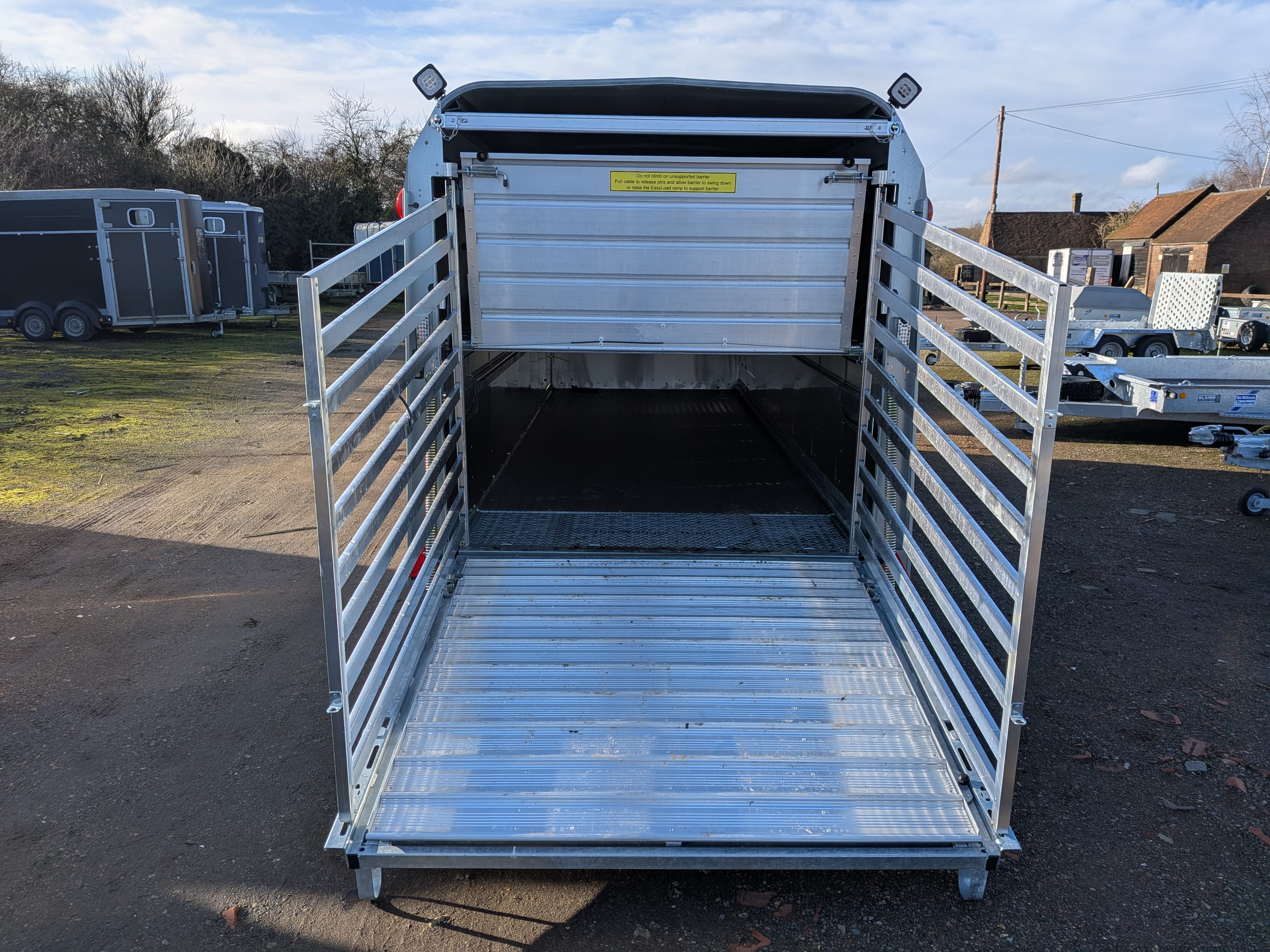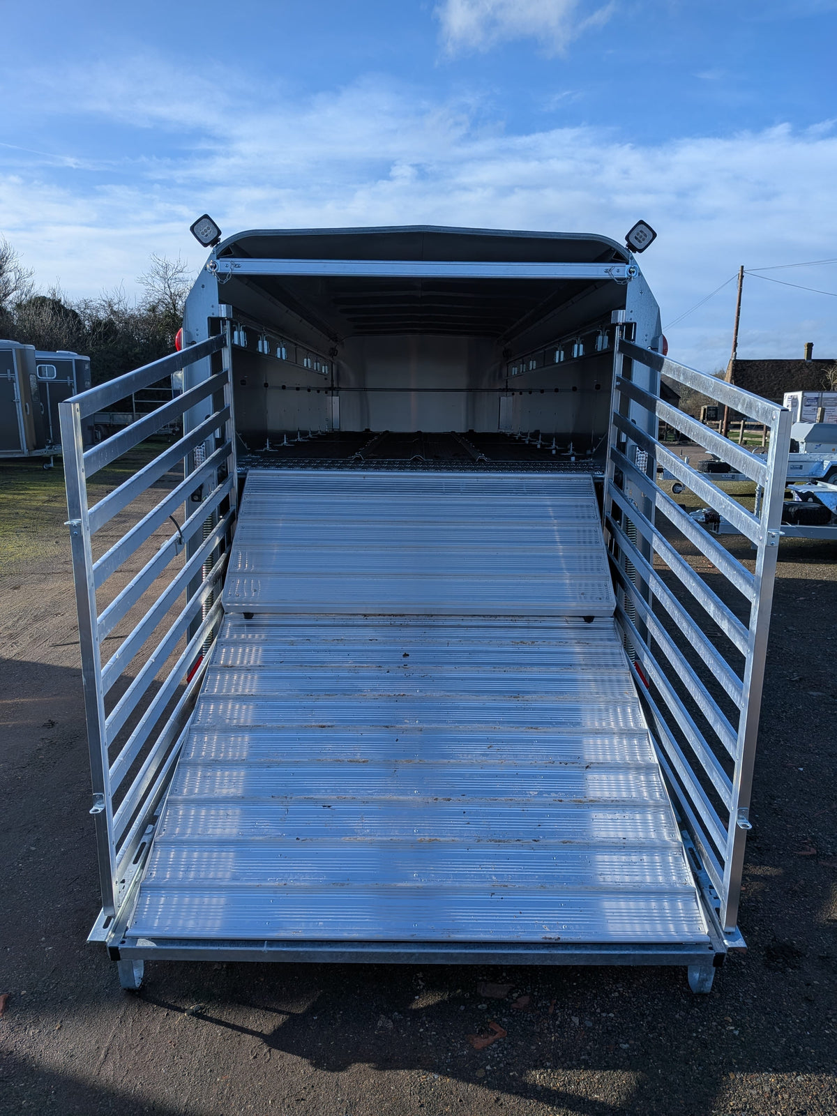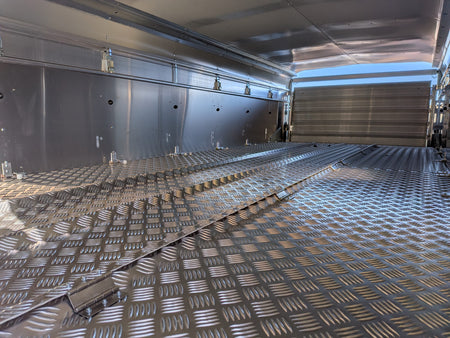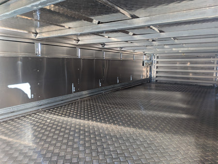 Fitted with a tri axle beam, leaf sprung suspension, galvanized steel chassis, aluminium side panels, heat reflecting roof, and grip-faced aluminium planking covered rear ramp.